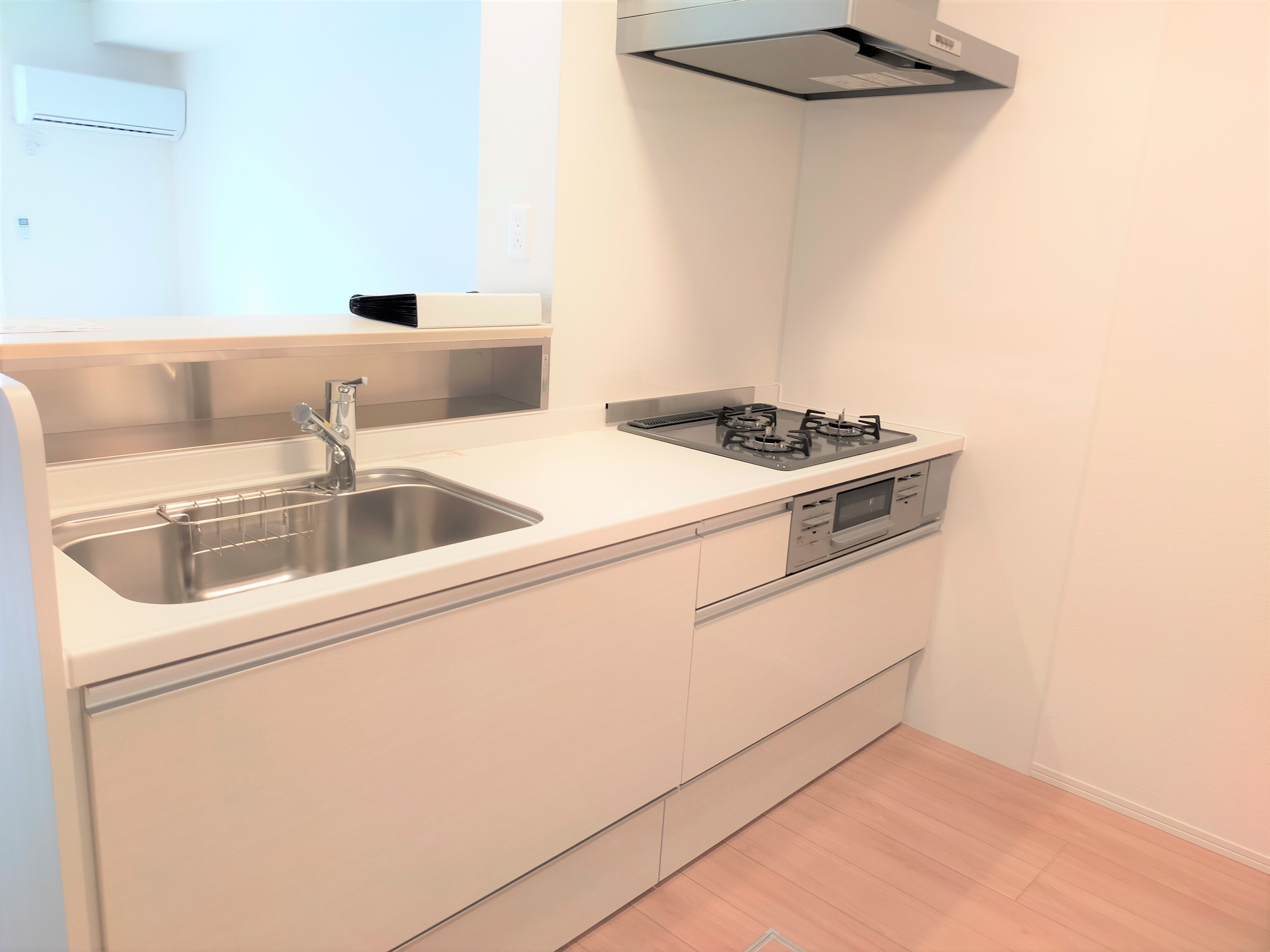 キッチンは3口コンロ、グリル付きです。流しも広めで蛇口の奥には調味料などを置けるスペースもあります。